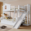 Das Etagenbett bietet zwei Liegeflächen von 90x200 cm und 120x200 cm, ideal für Kinder. Es ist aus massivem Kiefernholz gefertigt und verfügt über eine Rutsche, einen Rausfallschutz sowie einen stabilen Lattenrost aus Sperrholzplatte. Die obere Liegefläche ist mit einem umlaufenden Absturzschutz ausgestattet. Das Bett ist für Kinder ab 6 Jahren geeignet und hat eine maximale Belastbarkeit von 100 kg pro Liegefläche.