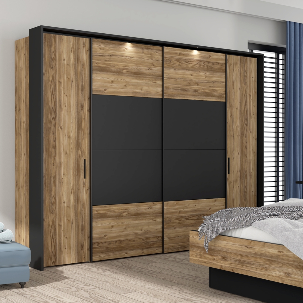 FORTE Jabim Kleiderschrank mit LED Beleuchtung, Holzwerkstoff, Braun/Schwarz, 279,4 x 214,9 x 64 cm