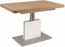 Höhenverstellbarer und ausziehbarer Couchtisch aus Wildeiche Bianco. Mit einem Aufstellmaß von 110,0 x 57,0 x 70,0 cm lässt sich der Tisch stufenlos von 57,0 cm bis 76,0 cm in der Höhe verstellen und auf eine Länge von 150,0 cm ausziehen. Die Tischplatte ist biancofarbig lackiert, während die Wangen aus MDF in Reinweiß (RAL 9010) gefertigt sind. Pflegeleichte Oberflächen sorgen für eine einfache Reinigung.