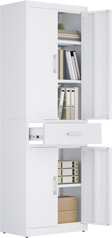 Kompakter und leistungsstarker Aktenschrank mit einer Höhe von 180 cm, einer Breite von 60 cm und einer Tiefe von 34 cm. Aus robustem Stahl gefertigt, bietet dieser verschließbare Schrank drei verstellbare Regale, die jeweils bis zu 25 kg tragen können, sowie eine praktische Schublade für kleinere Gegenstände. Ideal für Büro, Küche oder Garage, sorgt er für eine sichere und organisierte Aufbewahrung Ihrer Dokumente und Utensilien.