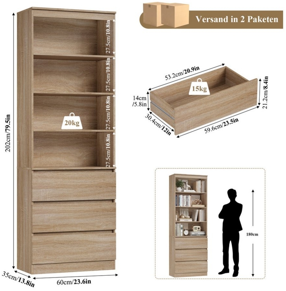 Homfa Bücherregal Hochschrank Standregal Bücherschrank Raumteiler, mit 4 Fächern und 3 Schubladen, 60 x 35 x 202 cm Bild 1