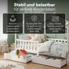 Gefertigt aus massivem Kiefernholz mit weißem Lack, überzeugt das Kinderbett durch seine robuste Konstruktion. Es ist bis zu 100 kg belastbar und begleitet dein Kind zuverlässig über viele Jahre hinweg.