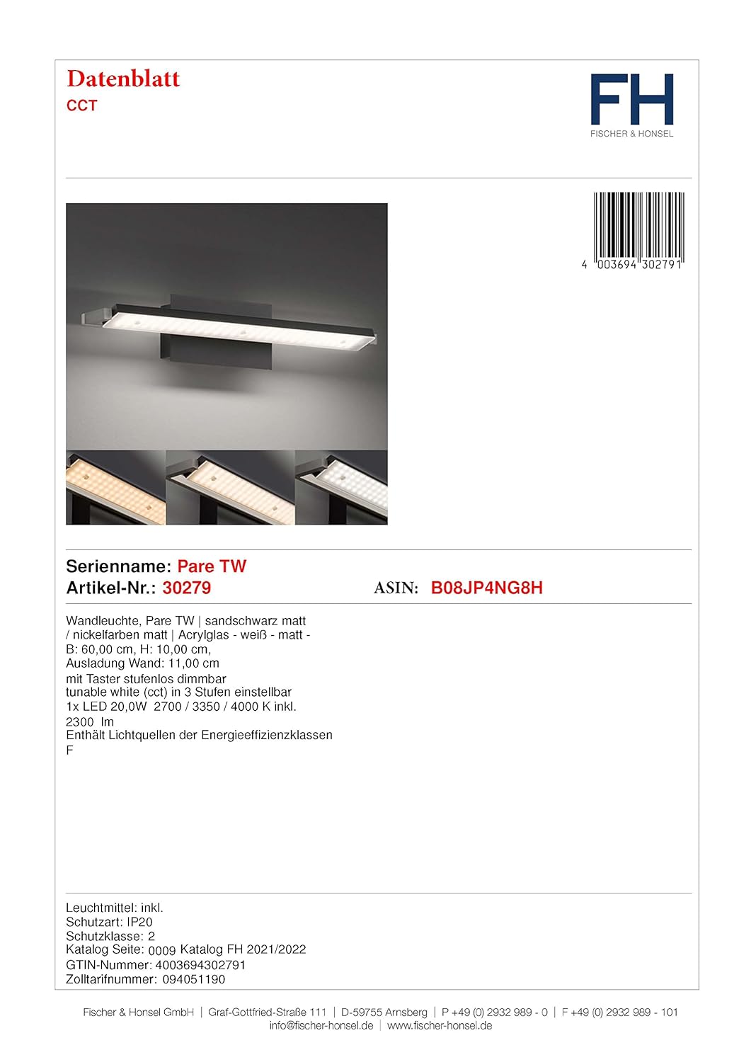 Die Pare Wandleuchte aus Metall in sandschwarz ist ein stilvolles und modernes Beleuchtungselement für Ihr Zuhause. Mit ihrem schlichten Design fügt sie sich nahtlos in jeden Raum ein. Das Metall ist in einem matten sandschwarzen und nickelfarbenen Finish gehalten, während das Acrylglas in einem matten Weißton erstrahlt. Die Leuchte ist schaltbar mit einem Taster und stufenlos dimmbar, um die gewünschte Atmosphäre zu schaffen. Mit einer Breite von 60 cm und einer Höhe von 10 cm hat sie die perfekte Größe, um einen Raum optimal auszuleuchten. Die Ausladung von der Wand beträgt 11 cm. Die Pare Wandleuchte wird mit einem LED-Leuchtmittel geliefert, das nicht austauschbar ist und eine Lebensdauer von 20000 Stunden hat. Sie bietet eine Helligkeit von 2200 Lumen und die Farbtemperatur ist einstellbar zwischen 2700 Kelvin, 3350 Kelvin und 4000 Kelvin. Die Schutzklasse der Leuchte ist 2 und die Schutzart ist IP20. Im Lieferumfang enthalten ist 1x Pare Wandleuchte - Metall sandschwarz. Bitte beachten Sie, dass eventuell abgebildete Dekorationsartikel, Beleuchtungen, Hi-Fi-Geräte oder ähnliches nicht im Lieferumfang enthalten sind.