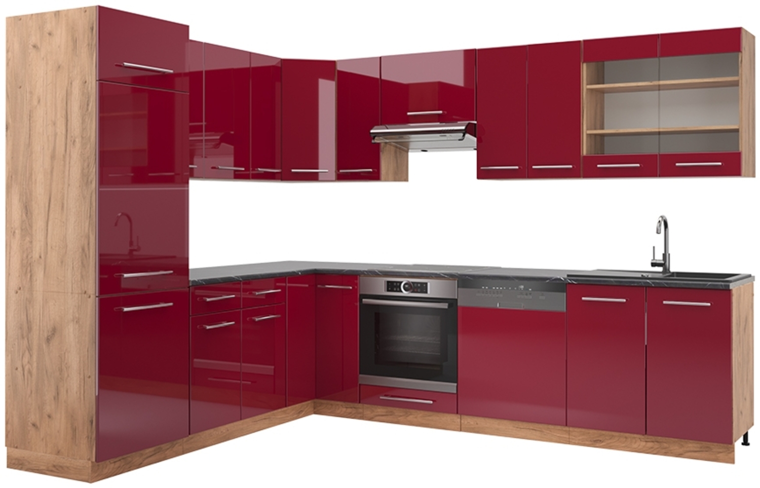 Eckküche Fame-Line Bordeaux Hochglanz/Goldkraft Eiche 227 x 60 cm , AP Anthrazit Vicco