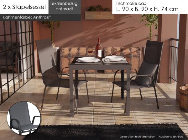 Gartenmöbel Set Alu Tisch 3-tlg. 2x Stapelsessel Gartenset Essgruppe Sitzgruppe anthrazit