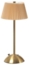 Stilvolle LED Tischleuchte GENUA mit einem goldfarbenen Metallfuß und einem braunen Lampenschirm. Diese wiederaufladbare Tischlampe bietet drei Lichtfarben (warmweiß, Tageslicht und eine Mischung) und ist stufenlos dimmbar von 60 bis 120 Lumen. Mit einer Höhe von 30,5 cm und einem Durchmesser des Schirms von 15 cm passt sie perfekt auf Esstische, Nachttische oder Kommoden. Die Lampe ist ideal für gemütliche Abende oder zum Lesen.