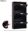 Flieks Schuhschrank in Schwarz bietet Platz für ca. 8 Paar Schuhe und überzeugt durch sein modernes Design. Mit den kompakten Maßen von 60 x 24 x 114 cm und drei Klappen ist er ideal für kleine Flure. Der Schuhschrank verfügt über drei Einlegeböden und Fächer, die eine optimale Organisation ermöglichen. Hergestellt aus MDF und Metall, ist er pflegeleicht und stabil.