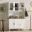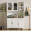 Dieses elegante Sideboard im rustikalen Landhausstil bietet mit seinen großzügigen Abmessungen von 114 x 40 x 190 cm umfangreichen Stauraum für Ihr Wohnzimmer oder Esszimmer. Die Kombination aus weißer Holzmaserung und brauner Arbeitsplatte schafft eine warme Atmosphäre. Fünf Türen, darunter zwei mit Glaseinsätzen, eine praktische Schublade und zwei offene Fächer ermöglichen vielfältige Aufbewahrungsmöglichkeiten. Hochwertige Dämpfungsscharniere sorgen für ein sanftes Schließen der Türen.