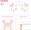 Tisch-Set mit 2 Stühlen, ideal für Kinderzimmer. Der Holztisch hat die Maße 50 x 50 x 44 cm und die 2 Stühle messen jeweils 26,5 x 26,5 x 50 cm. Hergestellt aus lackiertem Holz und MDF-Platte, bietet es eine robuste und sichere Nutzung. Das Set nimmt wenig Platz ein und dekoriert jede Kinderumgebung. Die Montage ist einfach und das Produkt entspricht der europäischen Norm.