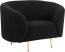 Klassischer Sessel im Art-Déco-Stil: Der schwarze Sessel LOEN strahlt Luxus aus, von den goldenen Beinen bis zum gepolsterten Bouclé-Design. Mit angenehmem Sitzkomfort und eleganter Formgebung ist er die perfekte Ergänzung für eklektische, traditionelle oder glamouröse Einrichtungen.