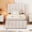 Dieses Polsterbett in der Größe 90 x 200 cm vereint klassisches Design mit praktischen Funktionen. Die dezente Beige-Farbe und das klare Liniendesign schaffen eine harmonische Atmosphäre, ideal für Kinder-, Jugend- oder Gästezimmer. Das höhenverstellbare, schwammgefüllte Kopfteil ermöglicht die Kombination mit verschiedenen Matratzenhöhen. Das ausziehbare Unterbett kann als Gästebett genutzt werden, während drei integrierte Schubladen zusätzlichen Stauraum bieten.