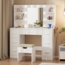 Dieser große Schminktisch in Weiß bietet mit seinen 7 geräumigen Schubladen und einer großen Tischplatte von 108x40 cm ausreichend Stauraum für Ihre Make-up- und Beauty-Produkte. Die 10 einstellbaren LED-Lichter mit 3 Lichtfarben und der große Spiegel von 52x41 cm sorgen für optimale Lichtverhältnisse. Mit einer eingebauten Steckdose und 2 USB-Anschlüssen ist er zudem praktisch für das Aufladen von Geräten. Stabilität und Langlebigkeit sind durch die robuste Spanplatte und die Kippschutzvorrichtung gewährleistet.