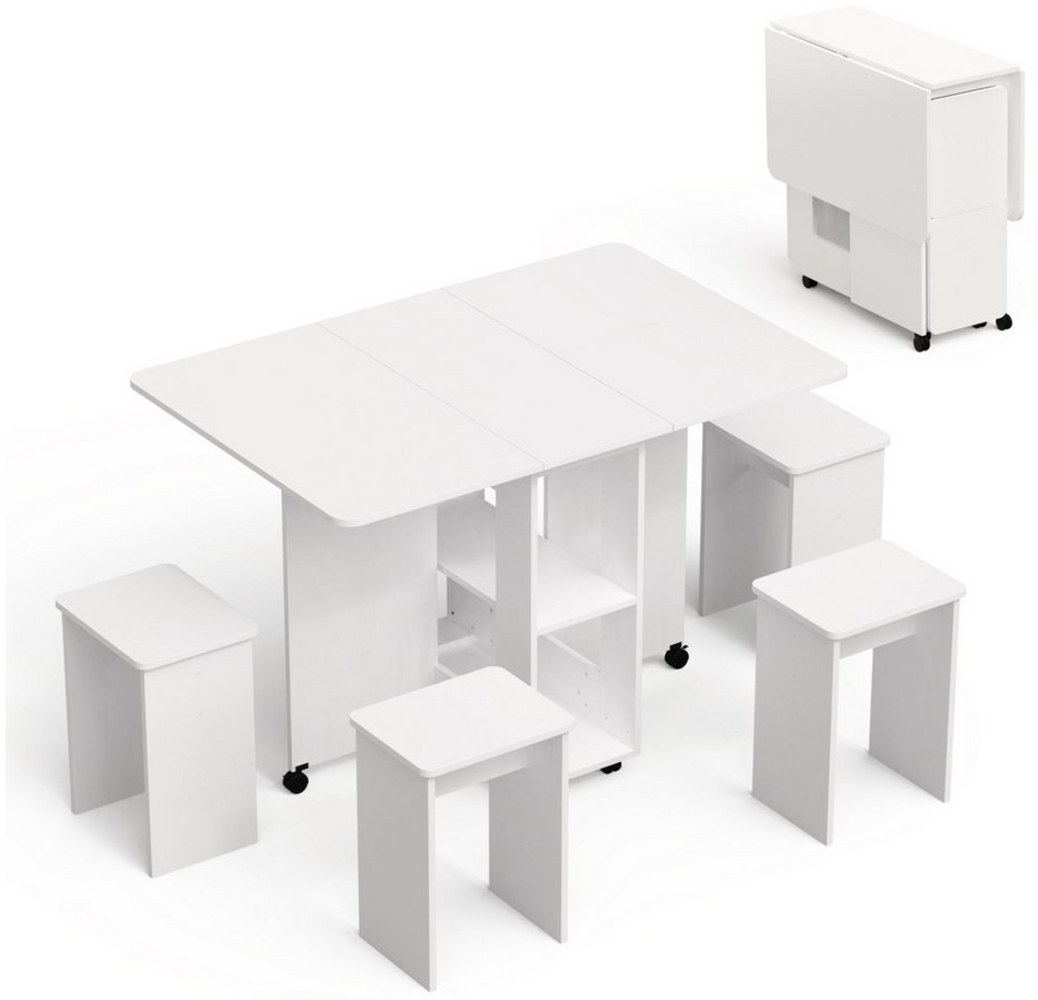 Der Mondeer Esstisch mit 4 Hockern ist die ideale Lösung für kleine Räume. Mit einer Größe von 120x80 cm bietet er Platz für verschiedene Nutzungsmöglichkeiten als Frühstückstisch, Esstisch oder Stauraum. Die mobile und stabile Konstruktion aus umweltfreundlicher Spanplatte sorgt für eine einfache Montage und hochwertige Verarbeitung.
