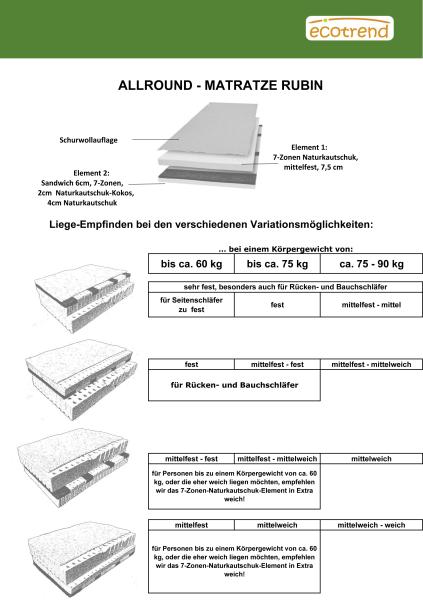 Daraus ergeben sich folgende Variationsmöglichkeiten: sehr fest Sandwich mit Kokos-Latex-Zonen oben fest: Sandwich mit 4cm Naturkautschuk oben, darunter Kokos-Latex-Zonen mittelfest: 7,5 cm Naturkautschuk oben, darunter Kokos-Latex-Zonen mittel: 7,5 cm Naturkautschuk oben, Kokos-Latex-Zonen unten.