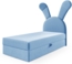MEBLINI Kinderbett KANINCHEN 100 x 200 cm Rechts – H3/Blau Samt Gepolstert. Dieses stilvolle Einzelbett mit Bettkasten bietet nicht nur einen komfortablen Schlafplatz, sondern auch praktischen Stauraum. Die eingebaute Bonell-Federkernmatratze H3 sorgt für eine optimale Anpassung an die Körperform. Das entzückende Kopfteil in Form von Hasenohren und der robuste Aufbau machen es zu einem idealen Möbelstück für jedes Kinderzimmer.