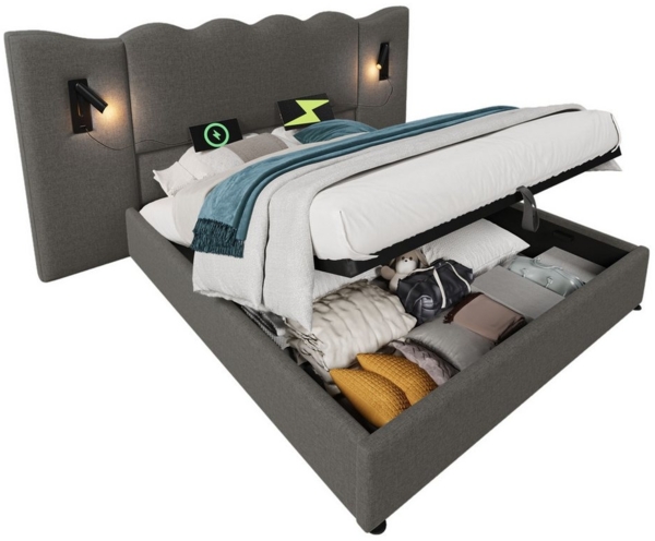 Das HAUSS SPOLE Polsterbett 180x200 cm in Grau vereint modernes Design mit praktischen Funktionen. Das elegante, wellenförmige Kopfteil aus atmungsaktivem Leinen sorgt für Komfort und Stil. Mit einer integrierten 360° Leselampe und USB sowie Type-C Ladeanschlüssen ist es ideal für entspannte Abende. Das hydraulische Stauraumbett bietet zusätzlichen Platz und eine stabile Konstruktion aus Metall und Massivholzlatten.