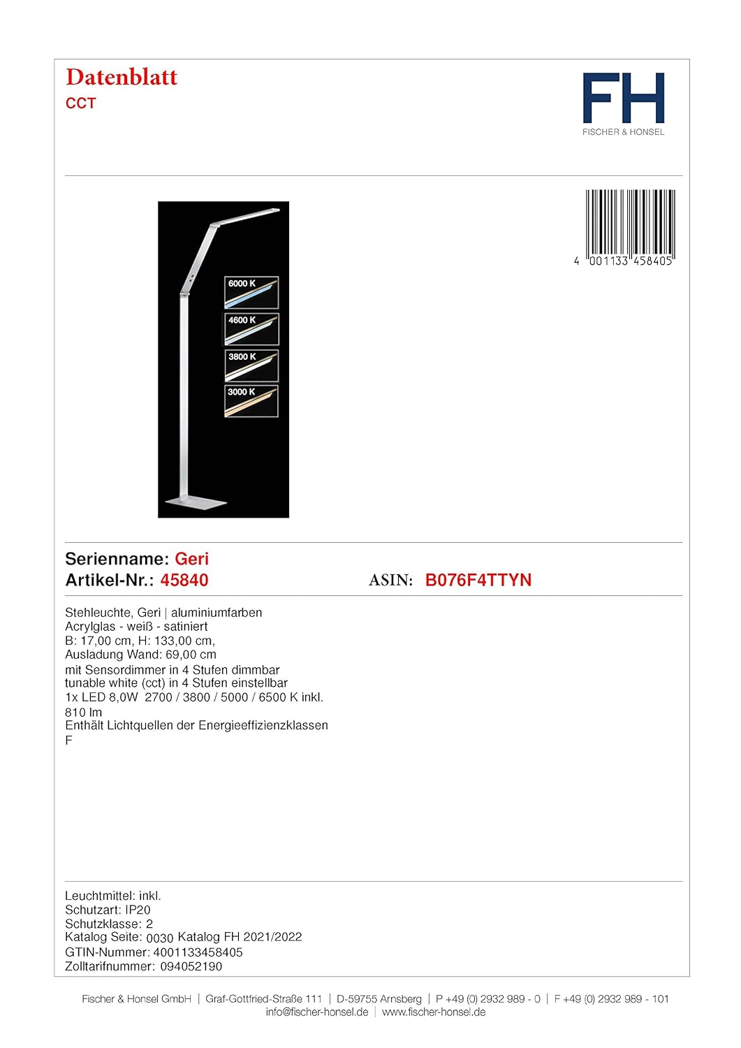 Die Fischer & Honsel 45840 Stehleuchte Geri aus Aluminium ist 133 cm hoch und 17 cm breit. Die Leuchte verfügt über eine Ausladung von 69 cm und wird aus Metall und satiniertem Acrylglas hergestellt. Mit einer Leistung von 8 Watt und einem Lichtstrom von 810 lm bietet sie eine variable Farbtemperatur von 2700 bis 6500 Kelvin. Die CCT-Technologie ermöglicht es, zwischen warmweißem und kaltweißem Licht zu wählen. Die Stehleuchte ist dimmbar in 4 Stufen und bietet eine einstellbare Lichtfarbe. Perfekt für verschiedene Lichtszenarien im Wohnraum, Homeoffice oder Flur.