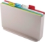 Das Joseph Joseph Index Regular 4-teiliges Schneidebrett Set in Silber ist ein praktisches und stilvolles Küchenaccessoire. Mit einem effektiven, farbcodierten System hilft es, Kreuzkontaminationen zu vermeiden. Die Bretter sind messerfreundlich und leicht zu reinigen, während die abgeschrägten Kanten Krümel und Flüssigkeiten auffangen. Jedes Schneidebrett hat die Maße 30 cm x 20 cm und wird mit einem stabilen Aufbewahrungsständer geliefert.