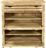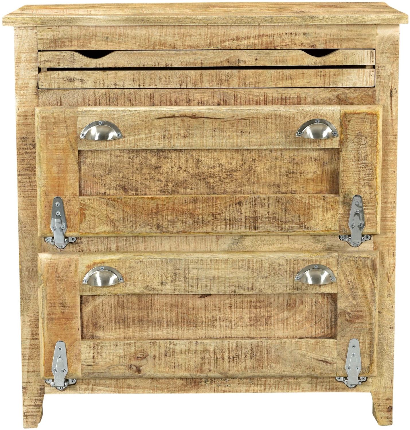 Der Schuhschrank Frigo aus massivem Mangoholz überzeugt durch sein einzigartiges Design und die besondere Struktur des Holzes. Die sichtbare Maserung verleiht jedem Möbelstück eine individuelle Note. Mit einem charakteristischen goldenen Farbton und silberfarbenen Muschelgriffen bietet dieser Schuhschrank Platz für bis zu 12 Paar Schuhe.