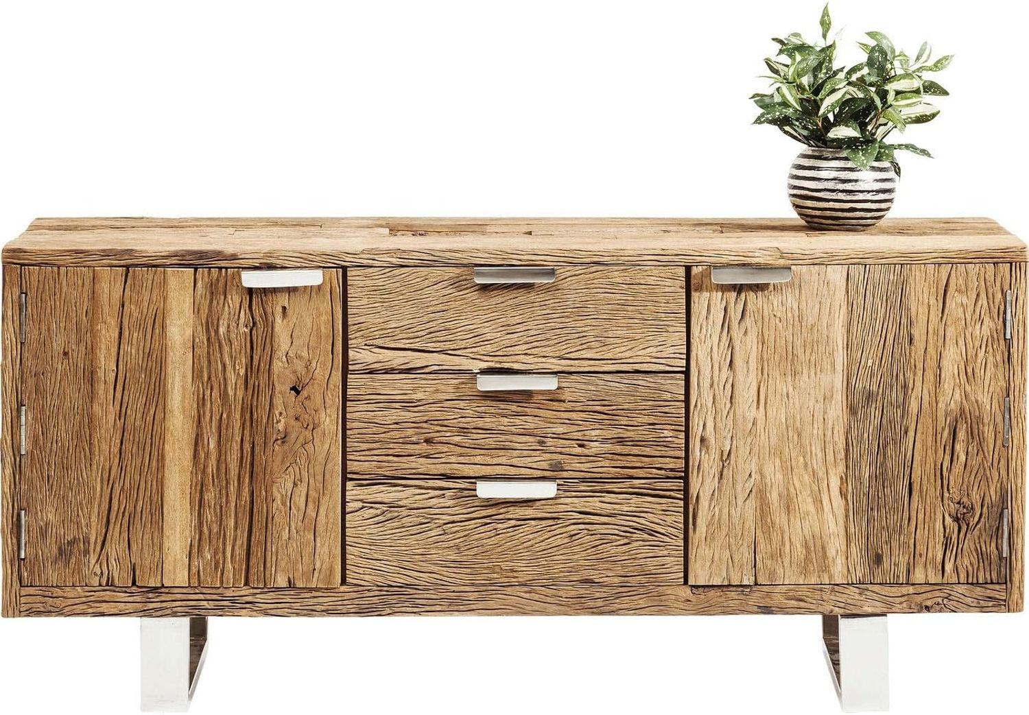 Das Kare Design Rustico Sideboard vereint rustikales und modernes Design in einem Möbelstück aus recyceltem Massivholz. Mit den Abmessungen von 75 x 160 x 40 cm bietet es großzügigen Stauraum. Ausgestattet mit drei Schubladen und zwei Türen, die jeweils zwei Böden enthalten, ist es sowohl funktional als auch ästhetisch ansprechend. Die Füße und Griffe aus glänzendem Edelstahl setzen einen spannenden Kontrast zum naturbelassenen Holz. Jedes Stück ist handgefertigt und somit ein Unikat.