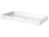 Dieses Hausbett, mit einer Liegefläche von 90x200 cm, ist ein toller Platz zum Schlafen und Spielen. Die Bettschublade gehört zum Lieferumfang dazu. Das Trägermaterial ist Massivholz und hochwertiges MDF in Weiß lackiert, das Dach ist schwarz abgesetzt. Die Liegefläche, mit einer Einstiegshöhe von ca. 36 cm, hat an den Seiten und Vorne eine Umrandung, die 66 cm hoch ist. Ein hübsches Detail, was die Hausoptik unterschreicht, ebenso wie die Verstrebungen zum Dach hin. Dies trägt auch mit den durchgehenden Bettpfosten zu einer hohen Stabiliät bei. Das komplett geschlossene Dach hat senkrechte Fräsungen. Warnhinweis: Das Dach darf nicht bestiegen werden. Die Liegefäche ist durch den 68 cm breiten Eingang zu erreichen. Die lichte Höhe ist vorne ca. 87,8 cm. Durch die niedrige Einstiegshöhe ist das Bett gut zu erreichen und bietet trotzdem noch eine Bodenfreiheit von ca. 20 cm. Das Bett hat keinen Lattenrost im Lieferumfang und ist für einen festen Lattenrost geeignet. Die Einlegetiefe für Lattenrost und Matratze ist ca. 12 cm. Das nach vorne abfallende Dach hat eine Maximalhöhe von ca. 174 cm, vorne ca. 125 cm. Die Rückseite hat ein Paneel bis zur Höhe der Umrandung, darüber ist das Bett offen. Die Bettschublade mit einem Innemaß von ca. 90x190 cm, ist ideal als zusätzliche Schlafgelegenheit und Stauraum für Spielsachen oder Bettwäsche. Das Material ist hochwertiges MDF weiß lackiert. Die Front der Bettschublade ist glatt. Die beiden Griffaussparungen sind ein nettes Detail und erleichtern gleichzeitig das Herausziehen und Hineinschieben der Bettschublade. Durch den Rollenauszug lässt sich die Schublade einfach bedienen. Die Innenhöhe der Bettschublade ist ca. 12 cm. Die durchgehende Bodenplatte ist Dekor beschichtet. Die Außenabmessung der Bettschublade ist ca. : B: 198,5 x H: 18,5 x T: 94 cm. Die Ware ist hochwertig verarbeitet und die Beschläge sind aus Metall. Der Lattenrost, die Matratze und die Deko gehören nicht zum Lieferumfang. Die Ware ist zerlegt, mit Montageanleitung zur einfachen Selbstmontage. Stellfläche gesamt ca. : B: 214,2 x H: 174 x T: 105,3cm + 94 cm bei ausgezogener Bettschublade.