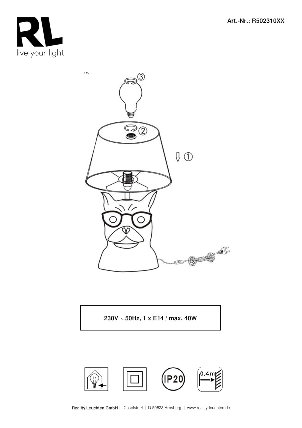 Mit der Serie DOSY lassen sich Akzente setzen. Die Tischleuchten im außergewöhnlichen Look sind auch ausgeschaltet echte Highlights. Der Textilschirm befindet sich auf einem Keramikfuß in Form eines Hundekopfes. Die bezaubernde Tischleuchte kann im Jugendzimmer ebenso wie im Schlafzimmer oder Wohnbereich aufgestellt werden. Die Form der Leuchte wird sowohl Groß als auch Klein eine Freude bereiten. Die Leuchte hat eine Höhe von 29 cm und einen Durchmesser von 18 cm. Ebenso ist die Leuchte mit einem Schnurschalter ausgestattet, wodurch sie bequem ein-und ausgeschaltet werden kann. Keramikfuß und Textilschirm sind in einheitlichem Schwarz gestaltet und werden in Kombination mit der chromfarbigen Brille zu einem echten Eyecatcher. Für eine energiesparende Beleuchtung empfiehlt sich die Verwendung eines LED Leuchtmittels. Diese sind eine optimale Alternative zu herkömmlichen Halogen Leuchtmitteln und stehen für eine hohe Lichtqualität und eine Energieeinsparung von bis zu 80%. Zusätzlich profitieren Sie bei LED Leuchtmitteln von einer langen Lebensdauer, einer geringen Wärmeentwicklung und schonen gleichzeitig die Umwelt. Technische Daten:Materialausführung: Korpus:Farbe Schwarz Material Keramik Schirm:Farbe Schwarz Material Stoff Produkteigenschaften:Schnurschalter IP20ohne Leuchtmittel Produktabmessungen:Höhe 29cm Durchmesser 18cm Daten:Leuchtmittel excl. 1x E14 · max. 40W Betriebsspannung 230V ~ 50 Hz Schutzklasse 2IP Klassifikation IP20 Verpackungsmaße und -gewicht:Breite 18,5cm Höhe 23cm Tiefe 18,5cm Gewicht 0,695kg Produkttyp Tischleuchte Leuchtmittelartohne Leuchtmittel Leistung [Watt]40 Farbeschwarz Material-Sockel E14dimmbarnein Schutzart IP20 Schutzklasse II Leuchtkraft [Lumen]keine Angaben Farbtemperatur-Farbtemperatur [Kelvin]keine Angaben