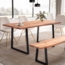 Design Massiver Esszimmertisch in modernem Design Ausdrucksstarke Baumkanten an zwei Seiten der Tischplatte Rechteckige Tischplatte mit natürlicher Holzmaserung Fester Stand dank der Metallbeine in TrapezformAbmessungen Breite: 140 cm Tiefe: ca. 80 cm Höhe: 76 cm Tischplattenstärke: 4 cm Weitere Abmessungen findest Du im Maßbild ACHTUNG: Die Tiefe des Tisches kann um wenige Zentimeter variieren, je nach Wachstumslinie des verwendeten BaumesFarbe Tischplatte: helles Goldbraun Beine: mattBesonderheiten Jeder Tisch wurde in Handarbeit gefertigt und ist somit ein absolutes Unikat Holzschutz bietet die Schutzlackversiegelung der Holzoberflächen Evtl. gegebene Unebenheiten im Boden lassen sich durch die höhenverstellbaren Noppen ausgleichen Geeignet für bis zu sechs Personen Empfohlene Maximalbelastbarkeit: 50 kg Jede Rissbildung, Astlöcher und andere Unregelmäßigkeiten des Holzes bleiben für den natürlichen Look bewusst sichtbarMaterial Tischplatte: Akazie Massivholz, mit Klarlack beschichtet Beine: pulverbeschichtetes EisenLieferumfang Ein Esstisch ohne Dekoration Montageanleitung & -material liegen der Lieferung beiMontage Lieferzustand: teilmontiert, lediglich die Beine müssen an die Tischplatte angeschraubt werdenPflegehinweiseDie Oberfläche mit einem lauwarm angefeuchteten Baumwolltuch reinigen. Keine Scheuermittel, scharfen Reinigungsmittel oder tropfnasse Tücher verwenden.