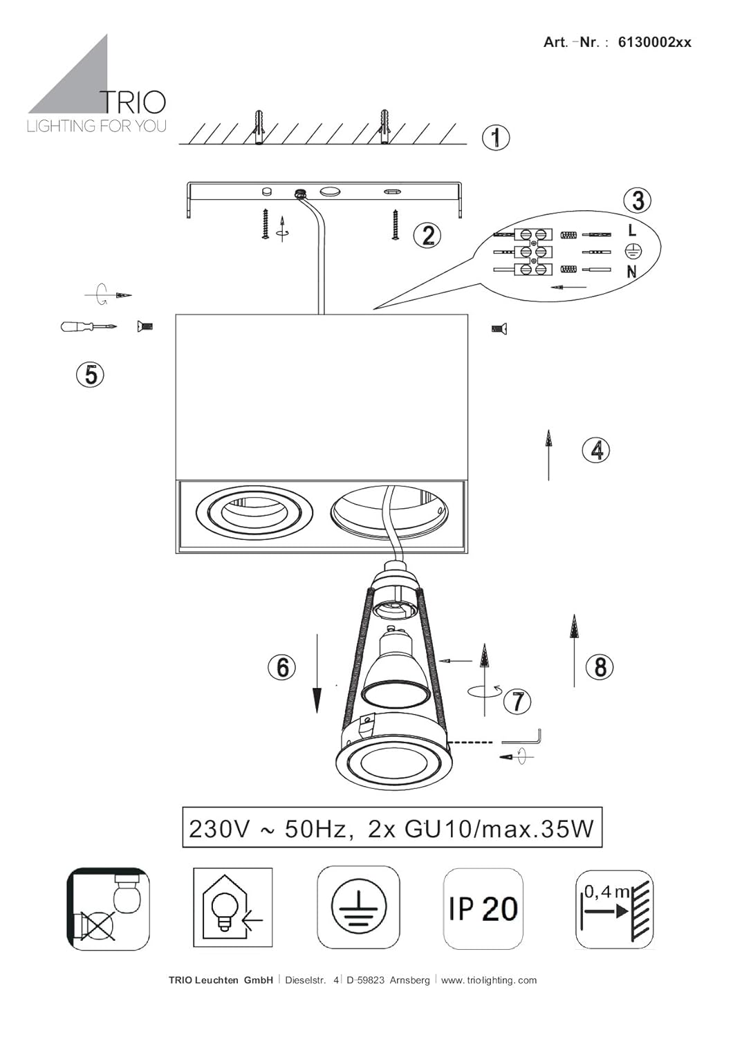 Schwenkbarer Aufbaustrahler BISCUIT aus dem Hause TRIO Leuchten Diese zeitgemäße Innenleuchte verleiht jedem Wohnbereich das Gewisse etwas!Dank des eckigen Designs aus schwarz mattem Metall ist die schwenkbare BISCUIT Spotlampe schon im Hellen ein wahrer Hingucker. Die Deckenleuchte ist jedoch nicht nur optisch attraktiv, sondern überzeugt auch durch ihre vielfältigen Einsatzmöglichkeiten. Die moderne, aufbauende Bauweise der 2 flammigen Leuchte eignet sich besonders, wenn man eine optische Abhebung im Raum wünscht. Durch die schwenkbaren Fassungen in der Leuchte, kann man die Lichtkegel optimal einstellen. Somit setzt diese Spotleuchte Kunststücke, Bildwerke oder antike und wertvolle Vasen gekonnt in Szene. Darüber hinaus können mehrere dieser Deckenlampe für Vitrinen-, Flur-, Galerie- oder Kochinselbeleuchtung im Einsatz gebracht werden. Ob als stylishe Deckenlampe in Fluren und Dielen, als zeitgemäßer Strahler über Ihrem Esstisch in Küche oder Esszimmer, als Eyecatcher in Ihrem Wohnzimmer oder auch als Highlights in öffentlichen Bereichen, wie z.B. Büro, Geschäften oder Praxen. Auch als coole Deckenlampe für das Jugendzimmer ist diese BISCUIT Leuchte die richtige Wahl. Ganz gleich, welche Art von Lichtspots Sie für Ihre Zwecke benötigen, ob Sie auf der Suche nach Wohnzimmerlampen, Flurleuchten, Küchendeckenlampen, Schlafzimmerlampen, Büroleuchten oder sonstigen Wohnraumleuchten sind, dieser universell einsetzbarer Deckenstrahler wird all Ihren Ansprüchen gewiss gerecht!* Geeignet für 2 x GU10 Leuchtmittel bis max. 35 Watt (nicht enthalten)