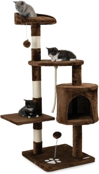 lionto Kratzbaum für Katzen mit 2 Plüschbällen & Spielseil, Höhe 112 cm, Katzenbaum mit Sisalseil & Plüsch, gemütliche Liegefläche & Höhle, inkl. Wandhalterung, für kleine & große Katzen, braun Bild 1