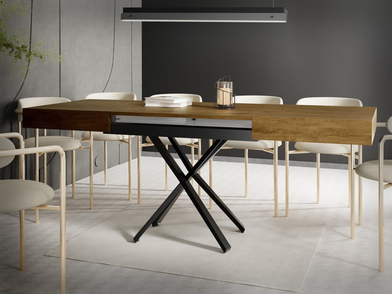 Der WFL GROUP Couchtisch Cavetta X vereint elegantes Design mit durchdachter Funktionalität. Mit einer innovativen Höhenverstellung von 27 bis 76 cm und einer ausziehbaren Tischplatte von 120 auf 200 cm ist er der ideale multifunktionale Tisch für Ihr Wohnzimmer, Esszimmer oder die Küche. Das markante X-Gestell aus pulverbeschichtetem Metall sorgt für Stabilität und einen modernen Industrial-Look.