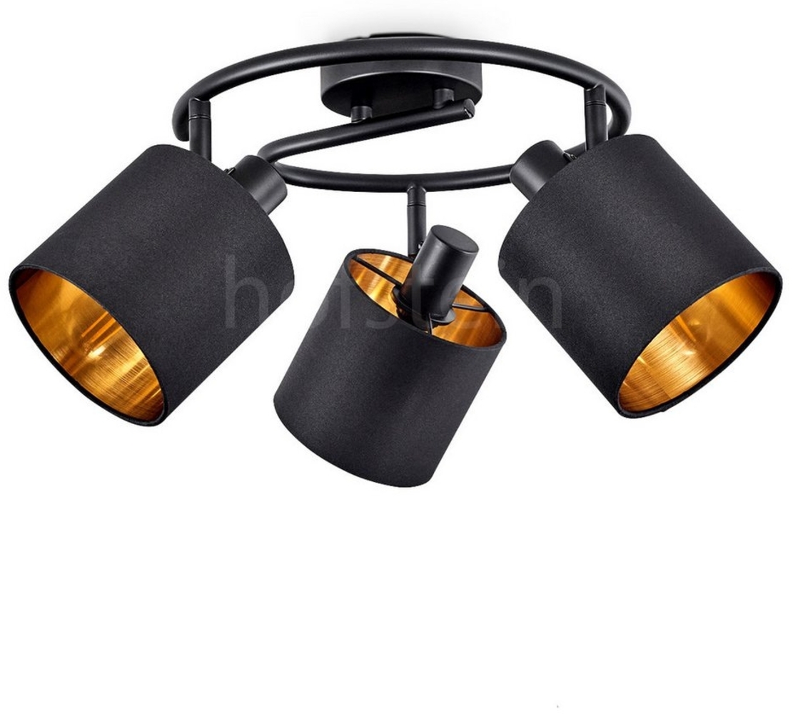 Moderne Deckenleuchte aus Metall und Stoff in Schwarz und Goldfarben. Diese 3-flammige Deckenlampe bietet verstellbare Strahler und ist ideal für verschiedene Innenräume wie Arbeitszimmer, Esszimmer, Küche, Schlafzimmer und Wohnzimmer. Mit einer Höhe von 24 cm und einem Durchmesser von 28 cm fügt sie sich harmonisch in Ihr Zuhause ein. Die Leuchte ist für E14 Leuchtmittel geeignet (nicht im Lieferumfang enthalten) und hat eine maximale Leistung von 40 Watt.
