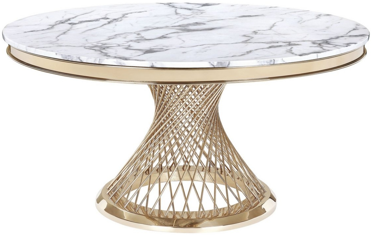 Erleben Sie mit dem alesvelt Wohnzimmertisch eine harmonische Verbindung aus Eleganz und hochwertigem Design. Die Tischplatte aus echtem Marmor mit einzigartiger Maserung und das goldene Edelstahlgestell bieten nicht nur eine luxuriöse Optik, sondern auch Stabilität und Langlebigkeit. Mit einem Durchmesser von 130 cm und einer Höhe von 76 cm ist dieser Tisch ideal für Ihr Wohn- oder Esszimmer.