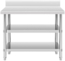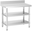 Edelstahltisch von Royal Catering mit den Maßen 100 x 60 x 96,5 cm bietet eine großzügige Arbeitsfläche und zwei zusätzliche Ablagen. Die hohe Tragkraft von 199 kg und die höhenverstellbaren Füße garantieren Stabilität, während die 115 mm hohe Aufkantung Wände und Umgebung vor Spritzwasser schützt. Ideal für professionelle Küchen, überzeugt dieser Tisch durch seine hygienischen und pflegeleichten Eigenschaften.