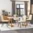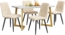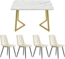 Dieses 5-teilige Essgruppenset vereint zeitlose Eleganz mit funktionaler Alltagstauglichkeit. Der Tisch mit den Maßen 117 x 68 x 75 cm verfügt über eine MDF-Tischplatte in Marmoroptik und goldfarbene Metallbeine. Die vier beige Leinenstühle (45 x 40 x 86 cm) bieten dank ihrer weichen Polsterung hohen Sitzkomfort. Mit stabilen schwarzen Metallbeinen und einer Gesamtbelastbarkeit von 50 kg für den Tisch und 150 kg für die Stühle ist dieses Set ideal für Esszimmer, Wohnzimmer oder Büro.
