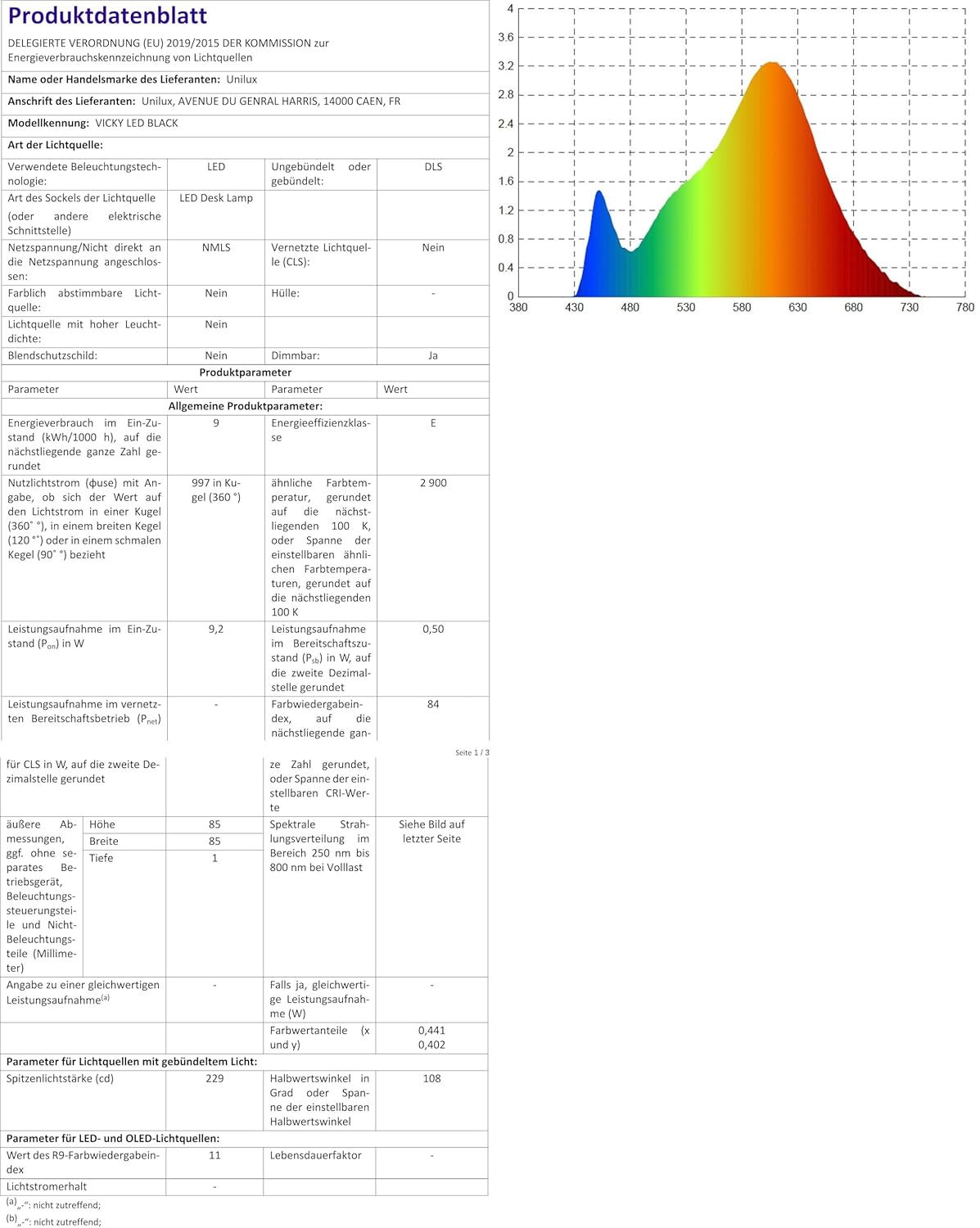 UNILUX LED-Tischleuchte VICKY, Buche/schwarz Leistung: 9,2W, gewichteter Energieverbrauch: 9k Wh/1000h, Lichtstrom: 997 Lumen, Farbtemperatur: 3000K warmweiß, Mindest-Farbwiedergabewert: 82 Ra, Lebensdauer: 50. 000h, enthält eine Lichtquelle der Energieeffizienzklasse E (400153732)Die Lampen können in der Leuchte nicht ausgetauscht werden Armlänge: 460 mm, Durchmesser Fuß: 180 mm, Leuchtenkopfum 360 Grad dreh- und neigbar, Material: Schirm, Arm und Fuß: Stahl mit Epoxid-Beschichtung, Schaft: Holz USB-Anschluss am Leuch LED-Tischleuchte VICKY Variable Leuchte in skandinavischem Design • Lichtquelle: Dieses Produkt enthält eine Lichtquelle der Energieeffizienzklasse E • die Leuchte enthält eingebaute LED-Lampen • die Lampen können in der Leuchte nicht ausgetauscht werden • Leistung: 9,2 W • Gewichteter Energieverbrauch: 9 k Wh / 1000 h • Lichtstrom: 997 Lumen • Farbtemperatur: 3000 Kelvin (warmweiß) • Farbwiedergabeindex (Ra): 84 • Lebensdauer: 50. 000 Stunden • Dimmer ermöglich drei verschiedene Lichteinstellungen • Einstellung über den Schalter am Leuchtenfuß je nach Anforderung wie z. B. konzentriertes Arbeiten, Lesen oder Entspannen • Schalter am Leuchtenfuß • im Fuß ist ein zusätzlicher USB-Anschluss integriert, um Kleingeräte wie Smartphones oder Lautsprecher zu laden • Lieferung ohne Ladekabel • für den Schaft wird Buchenholz aus FSC-zertifizierter Forstwirtschaft verarbeitet • Maße: Höhe im normalen Gebrauch 440 mm, Länge des Arms: 460 mm, Durchmesser Sockel: 180 mm • Leuchtenkopf um 360° dreh- und zusätzlich neigbar • Materialien: Schirm, Arm und Fuß: Stahl mit Epoxid-Beschichtung, Schaft: Holz (FSC zertifiziert) • Eurostecker