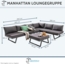 Die Destiny MANHATTAN Eckgruppe in dunkelgrau kombiniert modernes Design mit Funktionalität. Diese Loungegruppe besteht aus zwei Loungesofa-Elementen und einem Tisch/Hocker, die mit abnehmbaren und waschbaren Kissen ausgestattet sind. Das stabile Aluminiumgestell ist voll wetterfest und ermöglicht eine einfache Handhabung. Die abnehmbare Rückenlehne sorgt für vielseitige Aufstellmöglichkeiten.