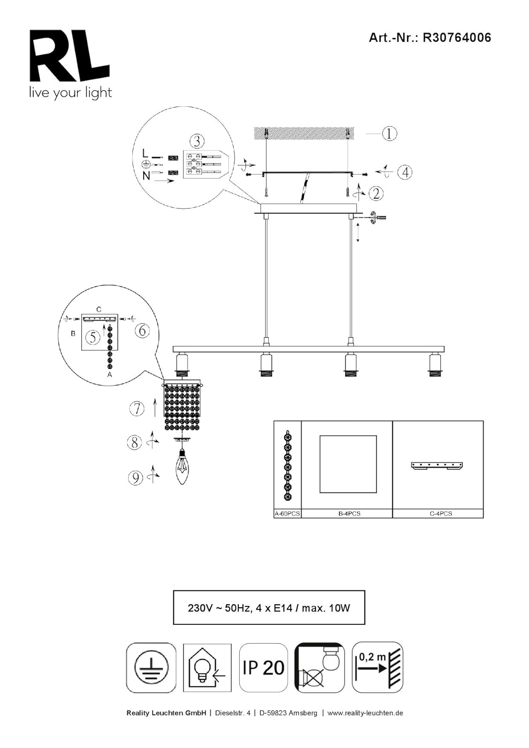 Beschreibung Diese Pendelleuchte ist garantiert ein Highlight in Ihrem Zuhause! Der funkelnde Acrylbehang ist das Herzstück der Leuchte und sorgt für ein besonderes Ambiente. Die Pendelleuchte zieht jeden Blick auf sich und wertet Räume optisch auf, indem sie als geschmackvolles Dekorationselement dient. Optimal kommt das 4-flammige Pendel mit einer Breite von 80 cm und einer individuellen Abhängelänge von jeweils max. 150 cm über dem Esstisch zur Geltung. Durch ihre neutrale Farbgebung in Chrom passt sich das Pendel an bereits vorhandene Farbkonzepte an. Im Lieferumfang ist kein Leuchtmittel enthalten. Details Leuchte • Leuchtentyp: Hängeleuchte• Material: Metall, chrom• Lampenschirm: Glas, Acrylkristalle, klar• Schutzart: IP20• Breite x Höhe x Tiefe in cm: 80 x 150 x 11• Gewicht: 2,11 kg • Fassungen: 4x E14• Leuchtmittel enthalten: Nein• Leistung Leuchtmittel: 4x max. 10 Watt• Spannung: 230V, 50Hz