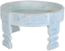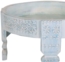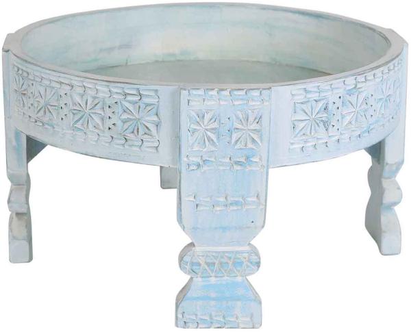 Handgeschnitzter orientalischer Beistelltisch Zaman in Blau aus Massivholz. Dieser runde Tisch, auch bekannt als Chakki Tisch, verleiht Ihrem Zuhause mit kunstvollen Sternenmustern einen Vintage bzw. Shabby Chic Look. Mit einem Durchmesser von ca. 55 cm und einer Höhe von ca. 30 cm ist er vielseitig einsetzbar als Couchtisch, Sofatisch oder Blumenhocker. Der Tisch wird fertig montiert geliefert und wiegt ca. 5 kg. Jedes Stück ist ein Unikat, gefertigt in traditionellem Kunsthandwerk.