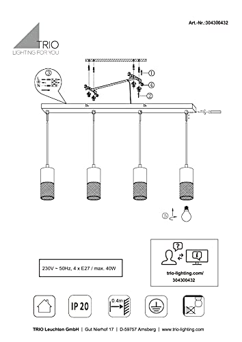 Industrial Pendelleuchte TOSH mit vier Metallschirmen aus Drahtgestell in Schwarz matt und Holz Lampenfassungen aus dem Hause TRIO Leuchten Drahtleuchten liegen total im Trend!Zeitlose Materialien, wie Metall und Holz, sorgen nicht nur für schlichte Eleganz, sondern auch für ein modernes Erscheinungsbild. Der individuelle Charme der dekorativen Leuchte TOSH erzeugt ein gemütliches Ambiente zum Wohlfühlen. Die Leuchte ergänzt mit ihrem dekorativen Metallgehäuse jeden Wohn- und Schlafraum perfekt und eignet sich besonders für moderne Wohnstile mit Industrie Charakter oder Vintage-Ambiente. Die Innenlampe lässt sich prima in verschiedene Einrichtungsstile integrieren und ist dank des modischen Gitter Designs schon im Hellen ein wahrer Hingucker. Die filigranen Leuchtenschirme kreieren ein traumhaftes Spiel von Licht und Schatten und können ideal über dem Esstisch platziert werden. Die Pendelleuchte hat eine maximale Abhängelänge von 150cm und vier 8 cm kleine Metallschirme. Somit können das Pendel auch ideal über Ihrem Esstisch oder Küchentisch aufhängen. Somit ist diese Retro Gitterlampe nicht nur optisch attraktiv, sondern überzeugt auch durch ihre vielfältigen Einsatzmöglichkeiten. Ob als stylishe Hängelampe in Fluren und Dielen, als zeitgemäßes Pendel über Ihrem Esstisch in Küche oder Esszimmer, als Eyecatcher in Ihrem Wohnzimmer oder auch als einladende Designerlampe in öffentlichen Bereichen, wie z.B. über einer Bar im Restaurant. Bei Verwendung eines dimmbaren Leuchtmittels können Sie das Pendel über Ihre Hausinstallation dimmen und so zusätzlich für eine ganz individuelle Beleuchtung sorgen. Lassen Sie sich von den faszinierenden Lichtspielen dieser modernen Leuchte begeistern!* Geeignet für 4 x E27 Leuchtmittel mit max. 40 Watt (nicht enthalten)