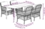5-tlg. Garten-Essgruppe mit Kissen Hellgrau Poly Rattan für gemütliche Mahlzeiten im Freien oder zum Entspannen im Garten. PE-Rattan ist robust und pflegeleicht, die Glasplatte des Tisches sorgt für Eleganz. Der Stahlrahmen ist stabil und der Sessel bietet mit gepolsterten Kissen hohen Sitzkomfort.