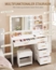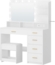 Schminktisch in elegantem Weiß mit 10 LED-Leuchten und großem Spiegel. Ausgestattet mit einem komfortablen Hocker, mehreren Schubladen und einem Haartrocknerhalter bietet dieser Frisiertisch ausreichend Stauraum und eine praktische Ladestation. Die 3 Beleuchtungsmodi und die einstellbare Helligkeit sorgen für die perfekte Beleuchtung während Ihres Make-up-Prozesses.