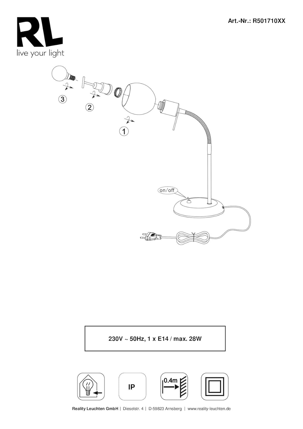 Diese Tischlampe ist ein praktisches Accessoire für Ihren Wohnraum oder Arbeitsplatz. Ihr modernes und ansprechendes Design macht sie zu einem attraktiven Blickfang, wo auch immer Sie sie zum Einsatz bringen. So leistet sie vor allem als schicke Schreibtischleuchte gute Dienste, indem Sie ein effektives Arbeiten gewährleistet. Durch den Flexarm ist die Tischlampe individuell biegsam, der Leuchtenkopf in Spotform lässt sich nach persönlichem Belieben einstellen. Mit einem Fußdurchmesser von 13cm und einer Höhe von 40cm - max. 48cm macht sie mit einer Ausladung von 28cm einfach überall eine gute Figur. Der integrierte Ein-Ausschalter unterstützt dabei die komfortable Bedienung der Leuchte. Auch als zusätzliche Lichtquelle in jedem anderen Wohnraum ist diese Tischleuchte in Silber matt ein Lichtwunder, denn sie lässt sich prima in jede Wohnumgebung integrieren: sei es als wohnliche Beleuchtung in Ihrem Wohnzimmer, als indirekte Beleuchtung in Dielen und Fluren oder aber als Leselampe und Nachttischlampe. Egal, ob Sie auf der Suche nach Arbeitsleuchten, Leseleuchten, Wohnzimmerlampen, Schlafzimmerlampen oder sonstigen Wohnraumleuchten sind: All diesen Ansprüchen wird die Tischlampe in jeder Hinsicht gerecht. Die Leuchte ist mit einer E14 Fassung ausgestattet und für Leuchtmittel bis max. 28 Watt geeignet (nicht enthalten).