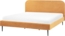Modernes Bettgestell mit Lattenrost Cord FLAYAT in Orange, das Ihr Schlafzimmer in eine stilvolle Oase verwandelt. Der Bezug aus weichem Breitcord sorgt für eine angenehme Haptik und verleiht dem Raum Wärme. Der stabile Lattenrost aus Massivholz bietet optimalen Halt für erholsamen Schlaf. Mit schlanken schwarzen Beinen setzt das Bett einen modernen Akzent und garantiert Stabilität.