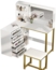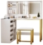 Der PXloue Schminktisch im L-Typ vereint modernes Design mit praktischen Funktionen. Mit einer Größe von 80 x 120 x 135 cm bietet er ausreichend Stauraum durch 5 Schubladen und wird durch drei einstellbare LED-Leuchten ergänzt. Der Hocker hat die Maße 40 x 40 x 30 cm und eine maximale statische Belastbarkeit von 150 kg.