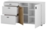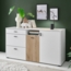 Kommode HUNTER-61 in weiß matt mit Eiche im Rillen-Design bietet eine stilvolle Lösung für Ihr modernes Wohnambiente. Mit großzügigem Stauraum und durchdachten Präsentationsflächen ist sie ideal für Ihre Dekorationsgegenstände. Die Softclose-Funktion sorgt für ein sanftes und geräuschloses Schließen der Türen und Schubkästen.
