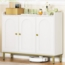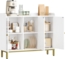 Das elegante Sideboard bietet mit seinen 3 Türen und der offenen Ablagefläche ausreichend Stauraum für Geschirr und Küchengeräte. Die verstellbaren Einlegeböden ermöglichen eine individuelle Anpassung des Stauraums. Hergestellt aus MDF-Holz und Metall, sorgt der stabile Metallsockel für zusätzliche Sicherheit. Mit einem stilvollen Design und einer einfachen Montageanleitung ist dieses Möbelstück ideal für Küche und Wohnzimmer.