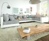 Die Couch Clovis XL in Weiß/Hellgrau mit Armlehne ist eine modulare Wohnlandschaft, die durch ihr eindrucksvolles Design und die großzügige Sitzfläche besticht. Sie bietet eine kuschelige Atmosphäre mit zahlreichen Kissen und ist aus strapazierfähigem Strukturstoff und Kunstleder gefertigt. Die Bonellfederkern-Polsterung sorgt für hohen Sitzkomfort.