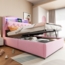 Dieses moderne Kinderbett (90x200 cm) vereint Komfort und Funktionalität in einem stilvollen Design. Es bietet großzügigen Stauraum unter der Liegefläche, der dank eines Gasdrucksystems mühelos zu öffnen ist. Das Kopfteil mit LED-Lichtband schafft eine gemütliche Atmosphäre, während die USB-Anschlüsse das Laden von Geräten erleichtern. Der weiche Samtstoff in Rosa und das stabile Metall-Lattensystem sorgen für Langlebigkeit und Eleganz.