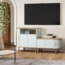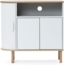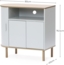 Modernes Sideboard in Grau-Weiß aus Holz mit 2 Türen, ideal für Wohnzimmer, Esszimmer und Schlafzimmer. Mit den Maßen B 80 x H 76,5 x T 40 cm bietet es ausreichend Stauraum. Die abgerundete Seitenfläche und die vertikale Rillenstruktur verleihen dem Möbelstück einen eleganten, modernen Charakter. Ein offenes Fach mit Kabeldurchführung und ein Doppeltürenschrank mit Push-to-Open-Mechanismus sorgen für eine klare Optik und Funktionalität.
