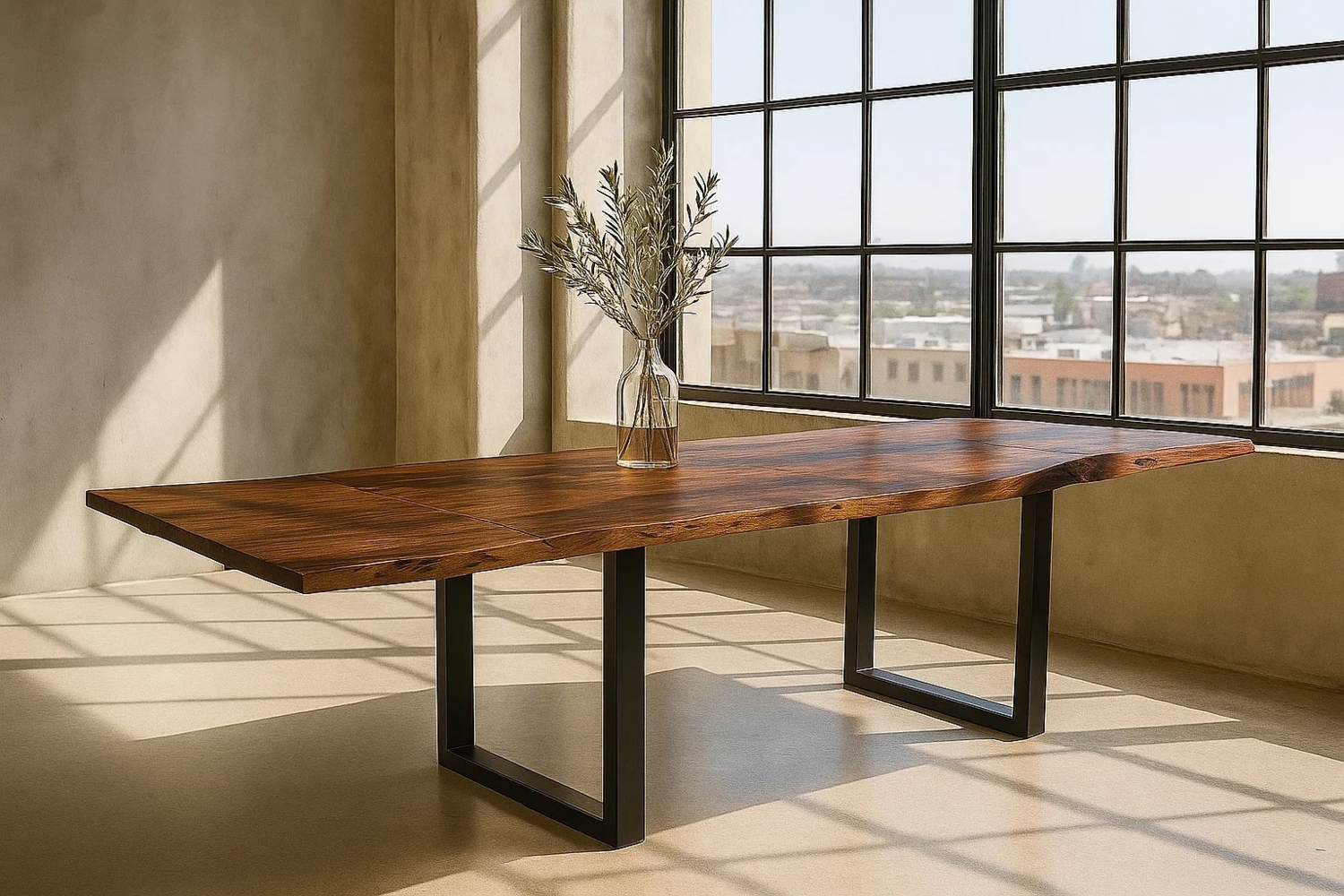 Edler Esszimmertisch Barcelona by Wolf Möbel, 160 (260) x 90 cm, Akazienholz massiv & nougatfarben, echte Baumkante, U-Gestell aus Metall Schwarz + 2 x Ansteckplatte 50 x 90 cm : Ausgeprägte Maserung – Unsere Tische sind geschliffen und lackiert, ansonsten aber völlig naturbelassen. Dadurch kommt die schöne Maserung des Akazienholzes besonders gut zur Geltung. Natur Pur – Besonderes Highlight des Esszimmertisches sind die Tischkanten, die den natürlichen Formen eines Baumes entsprechen und direkt aus dem Baumstamm geschnitten wurden. Die Kanten der Tischplatte behalten ihre ursprüngliche Form und geben so den individuellen Wuchs des Baumes wieder. Dadurch können die Maße des Tisches etwas variieren. Die Tischplatte kann kleine Astlöcher oder Spalten besitzen. Dies macht Ihren Baumkantentisch zu einem unverwechselbaren Unikat. Der Holztisch besitzt zwei Ansteckplatten, mit denen dieser auf 260 x 90 cm erweitert werden kann. Der Baumkantentisch ist mit Ansteckplatten gut geeignet für 8-12 Personen. Hochwertiges Unikat – Der Esstisch besteht aus massiven und robusten Akazienholz. Aufgrund der einzigartigen Maserung erhalten Sie ein Unikat mit individuellem Charakter. Das Kufengestell in U-Form sorgt für einen gelungenen Kontrast, welcher dem Massivholztisch einen Hauch von industriellem Look verleiht. Pflegeleicht – Die Oberfläche lässt sich leicht reinigen und pflegen. Verschmutzungen können mit einem mäßig feuchten Tuch problemlos entfernt werden. Regelmäßige Pflege erhält die natürliche Frische und die edle Ausstrahlung des Möbelstücks. Edles Design – Der Esszimmertisch überzeugt durch sein modern industrielles Design, das sich durch die klaren Formen, den warmen Farbton und die formschöne Maserung des Akazienholzes auszeichnet. Dieser edle und in liebevoller Handarbeit gefertigte Tisch besteht aus hochwertigen & langlebigen Materialien. Hinweis: Bei unseren Ansteckplattentischen ist die Holzmaserung der Ansteckplatten nicht durchgehend. Da die Platten separat gefertigt werden, kann es zu Abweichungen in der Maserung und im Farbverlauf kommen. Dies ist ein charakteristisches Merkmal der handwerklichen Fertigung und stellt keinen Qualitätsmangel dar. Maßangaben: : Gesamtlänge: ca. 160 cm (mit Ansteckplatten bis zu 260 cm)Gesamtbreite: ca. 90 cm Gesamthöhe: ca. 77 cm Materialstärke: ca. 3,5 cm Ansteckplatten: ca. 50 x 90 cm Innenabstand der Tischbeine: ca. 104 cm : :.Der Artikel wird zerlegt geliefert, mit ausführlicher Aufbauanleitung und Montagematerial.